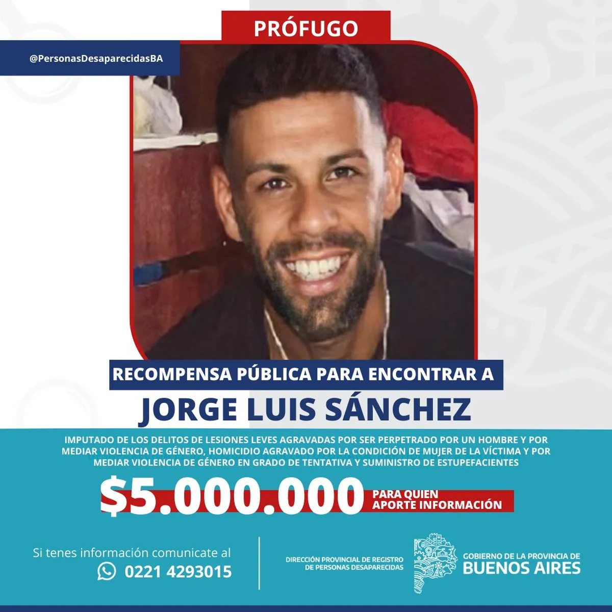 Los montos que ofreció el Ministerio de Seguridad de la Provincia de Buenos Aires oscilan entre los 2,5 millones y 5 millones de pesos para poder dar con el prófugo en Merlo. Sánchez tiene 34 años, es argentino y su DNI es 33.906.525. Según datos oficiales, su domicilio está ubicado en la calle pergamino al 2.100, en la esquina con Sullivan.