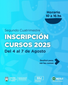 La Subsecretaría de Juventudes de Merlo abrió la inscripción a sus cursos gratuitos para el segundo cuatrimestre. Están destinados a jóvenes de 13 a 29 años y se dictarán en distintas sedes del área del 4 al 7 de agosto. Como parte solidaria de la iniciativa, se invita a cada inscripto a colaborar con la donación de un útil escolar.