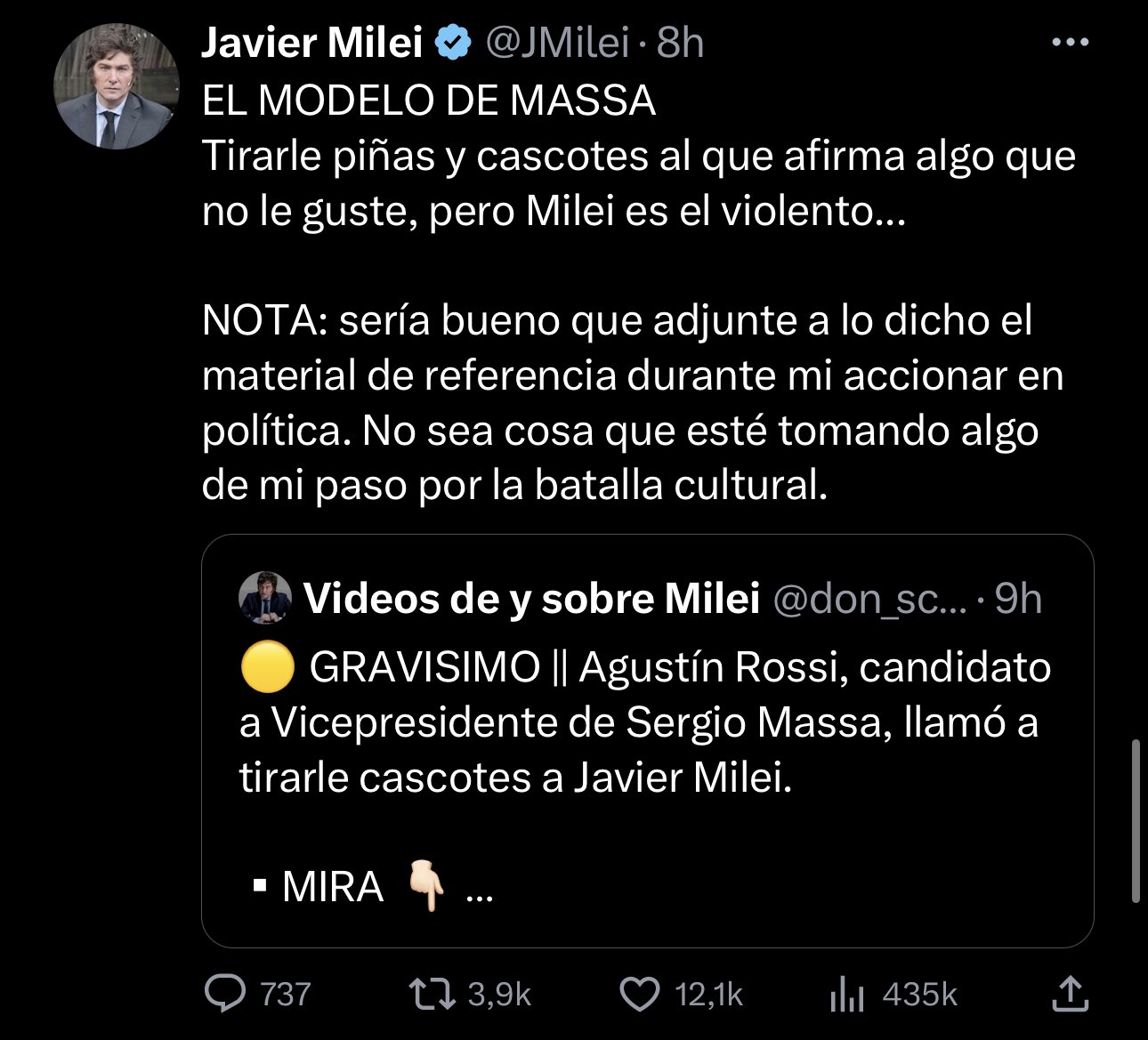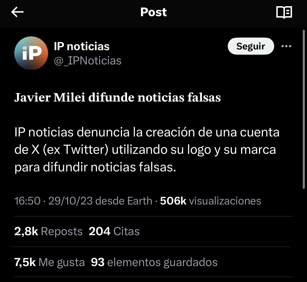 En las últimas horas, el candidato libertario fue el encargado de difundir una noticia más falsa que la otra. Una de las que mayor indignación causó fue el retweet de una supuesta noticia del medio IP Noticias. Allí se hablaba de un supuesto audio de Agustín Rossi, donde pide “tirarle cascotes” a Javier Milei. El mismo medio fue el encargado de desmentir mediante un comunicado oficial.