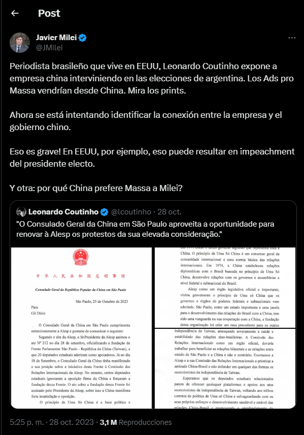 Luego, la siguiente fake news, el arma favorita de Javier Milei, fue una cita de una investigación periodística de una empresa china que intervino en la Argentina. Sin embargo, en el artículo que menciona, que fue escrito por Leonardo Coutinho, nunca se menciona a la Argentina, ni que una empresa de origen asiático estuvo vinculada con las elecciones que se llevaron adelante en nuestro país.
